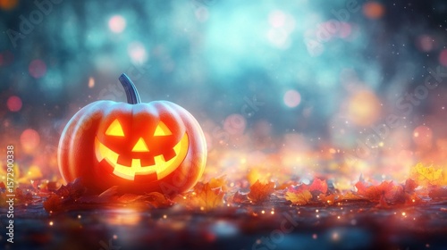 Fototapeta premium Glowing jack-o'-lantern amidst autumn leaves and bokeh