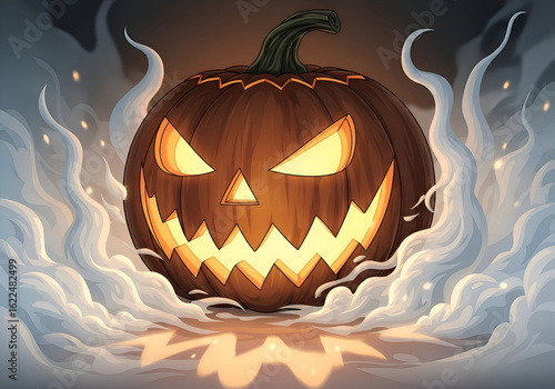 © Ahmad Faizrpl, Naklejka premium Glowing jack-o'-lantern amidst swirling smoke, Halloween ambiance.