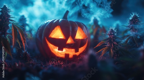 Naklejka premium Glowing Jack-o'-lantern in cannabis field, Halloween night, smoky background,...