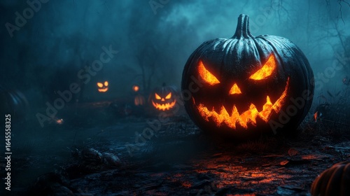 Naklejka premium Glowing Jack-o’-Lantern in Foggy Forest for Halloween Night