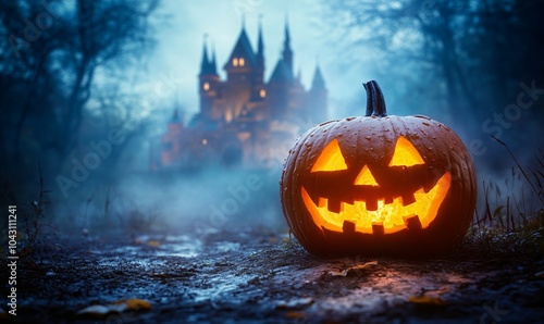 © Dmitry, Naklejka premium "Glowing jack-o'-lantern in front of spooky castle on Halloween night. Eerie atmosphere for poster or banner design."