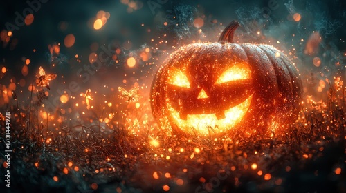 © ndari, Naklejka premium Glowing Jack-o'-lantern in spooky forest.