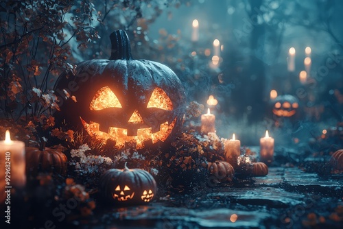 Naklejka premium Glowing jack o' lantern in spooky forest