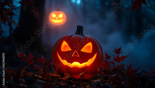 © Abul, Fototapeta premium "Glowing Jack-o'-Lantern in Spooky Forest – Cinematic Halloween Night Scene with Blue Fog and Autumn Leaves