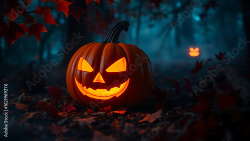 © Abul, Fototapeta premium "Glowing Jack-o'-Lantern in Spooky Forest – Cinematic Halloween Night Scene with Blue Fog and Autumn Leaves