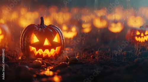 © NATTAKORN, Fototapeta premium Glowing Jack o Lantern in Spooky Pumpkin Patch During Halloween Night