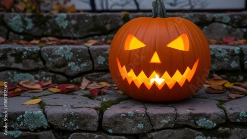Obraz premium Glowing jack-o-lantern on stone steps with autumn leaves in a spooky outdoor...