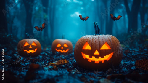 © Bartek, Fototapeta premium Glowing Jack o Lantern Pumpkins with Carved Smiling Faces in Dark Foggy Forest at Halloween Night