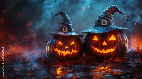 Fototapeta premium Glowing Jack-O'-Lantern Pumpkins with Witch Hats in Foggy Halloween Night