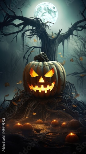 Fototapeta premium Glowing jack-o'-lantern sits before a spooky, gnarled tree under a full moon.