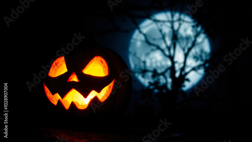 Fototapeta premium glowing jack-o'-lantern under a pale moon