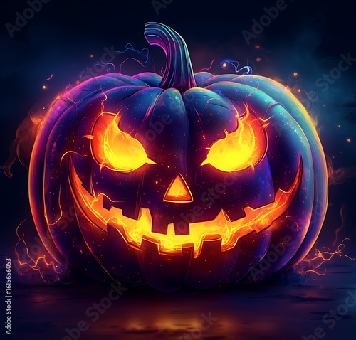 © Maria, Naklejka premium Glowing Jack O Lantern with Fiery Eyes and Mouth on Dark Background halloween pumpkin