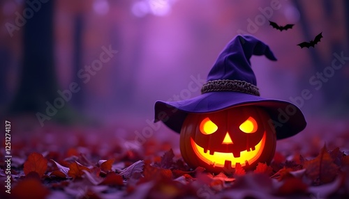 © Meheraj Hosen Mahid, Naklejka premium Glowing Jack-O'-Lantern With Witch Hat in a Spooky Autumn Forest Setting