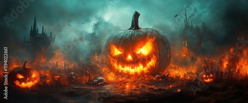 Naklejka premium Glowing jack-o'-lanterns amidst a fiery Halloween landscape with a haunted...