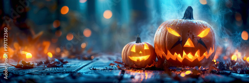 Fototapeta premium Glowing Jack O' Lanterns at night. Halloween Background