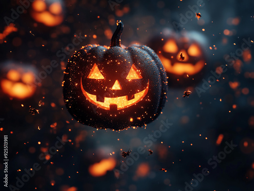 Fototapeta premium Glowing jack-o'-lanterns illuminate a dark forest during Halloween night...