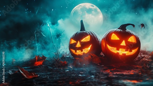 © hassan, Naklejka premium Glowing jack o’ lanterns illuminated by moonlight in a spooky halloween night scene with eerie atmosphere and shadows