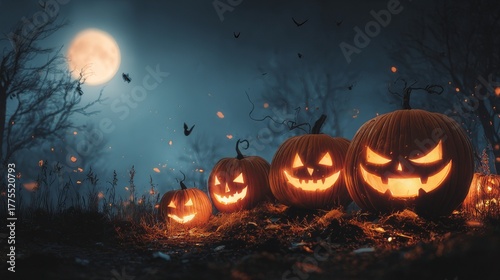 © Nayyab, Naklejka premium Glowing jack o’lanterns illuminating a dark forest under moonlight with spooky halloween atmosphere