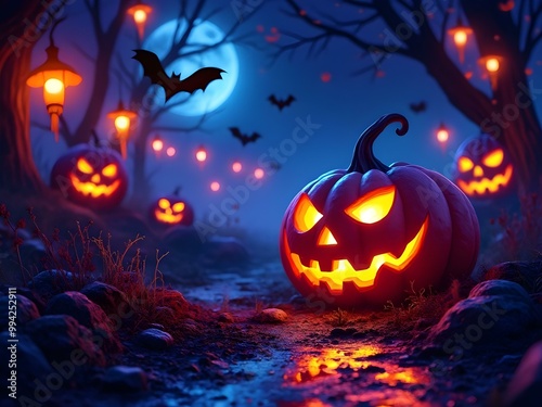 Naklejka premium Glowing Jack-o'-Lanterns in a Foggy Moonlit Forest