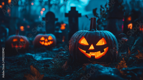 © Tahsin, Naklejka premium Glowing jack-o'-lanterns in a misty graveyard create a haunting Halloween atmosphere