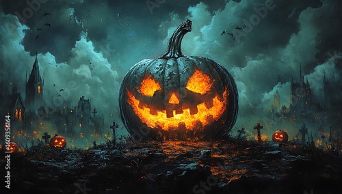 Fototapeta premium Glowing Jack O Lanterns in a Spooky Cemetery with Haunted Castle Background...