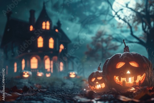 © boler, Fototapeta premium Glowing Jack-o'-Lanterns in Front of a Haunted House on a Foggy Halloween Night