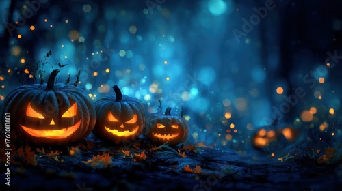 Fototapeta premium glowing jack o lanterns in magical forest