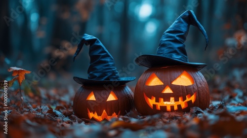 Naklejka premium Glowing Jack-o'-Lanterns with Witch Hats in a Spooky Halloween Forest