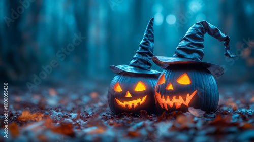Naklejka premium Glowing Jack-o'-Lanterns with Witch Hats in a Spooky Halloween Forest