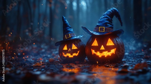 Fototapeta premium Glowing Jack-o'-Lanterns with Witch Hats in a Spooky Halloween Forest