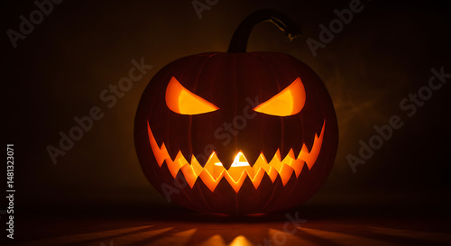 Fototapeta premium Glowing Jack OLantern with Spooky Carved Face in Dim Lighting