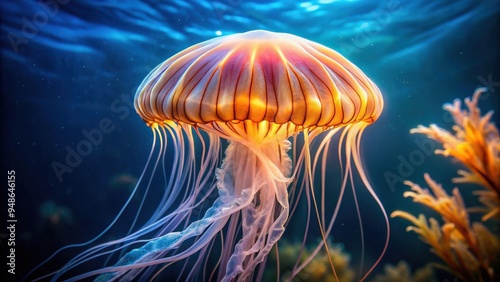 Obraz premium Glowing jellyfish Chrysaora pacifica floating gracefully underwater, marine...