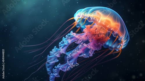 Naklejka premium Glowing Jellyfish Drifting in Deep Blue Ocean, Colorful Bioluminescent Tentacles, Peaceful Underwater Scene, and Marine Life