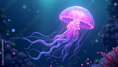 Fototapeta premium Glowing Jellyfish Floating Underwater with Tentacles in a Deep Blue Ocean