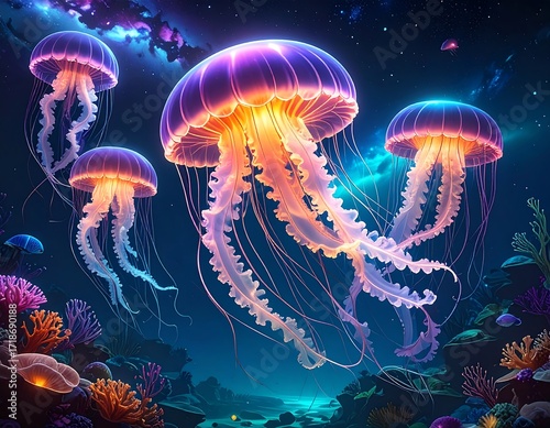 © Roda, Fototapeta premium Glowing jellyfish in a vibrant underwater scene (1)