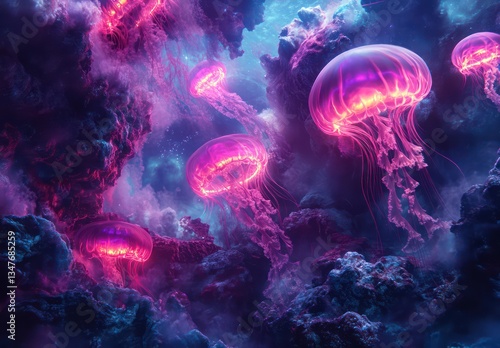 Fototapeta premium Glowing jellyfish ocean reef, fantasy art, underwater
