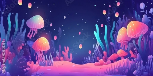 Naklejka premium Glowing Jellyfish Swim Amidst Vibrant Underwater Flora