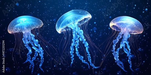 Fototapeta premium Glowing jellyfish swim in dark ocean depths, ideal for marine life projects
