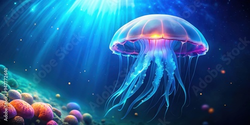 Naklejka premium Glowing jellyfish swimming gracefully underwater , bioluminescent, marine life, underwater world, ocean, sea creatures, ethereal