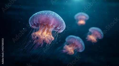 Obraz premium Glowing jellyfish underwater.
