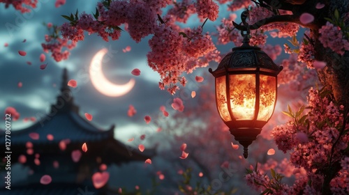 © KidsStation, Obraz premium Glowing Lantern Under Cherry Blossom Tree at Night