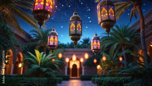 Obraz premium Glowing lanterns illuminate a tranquil courtyard at night. Warm light creates...