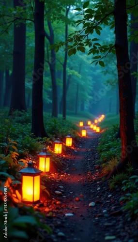 © Chanchai, Obraz premium Glowing lanterns lining a winding forest path,, nature