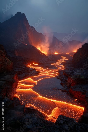 Fototapeta premium Glowing Lava Flowing Through Dark Volcanic Rocks at Night