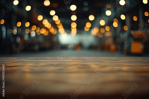 © vefimov, Fototapeta premium Glowing light from ceiling lamps illuminates a factory floor at night.