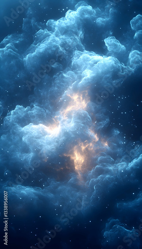 © Supriyono, Fototapeta premium Glowing light piercing through dark, dense clouds at night, with falling particles
