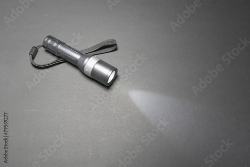 © alexstepanov, Naklejka premium Glowing metal flashlight with wrist strap