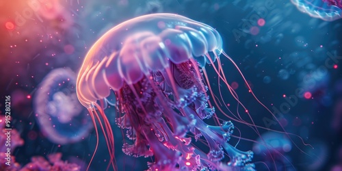 © AkuAku, Fototapeta premium Glowing Moon Jellyfish with Translucent Bell and Bioluminescent Glow
