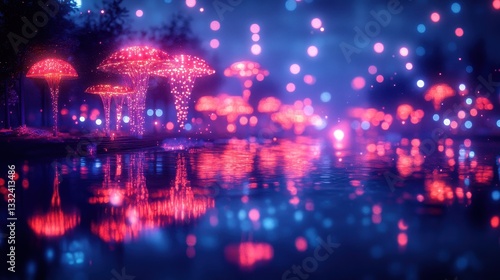 Fototapeta premium Glowing mushrooms by night lake, fantasy forest