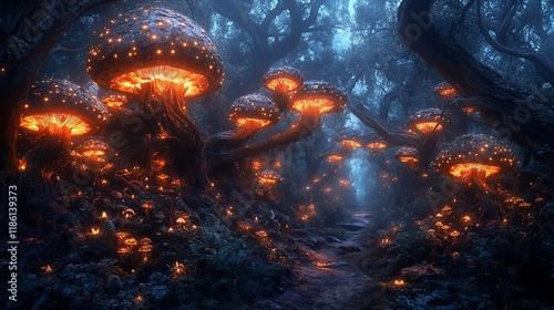 Naklejka premium Glowing mushrooms illuminate a mystical forest path.